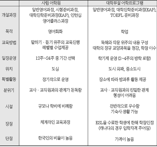 유학생들이 어학교육을 받는 장소에는 크게 사립어학원과 대학부설 어학 프로그램이 있다. 유학을 준비하는 학생들이 많이 헷갈려하고 있는 것이 사실이다.