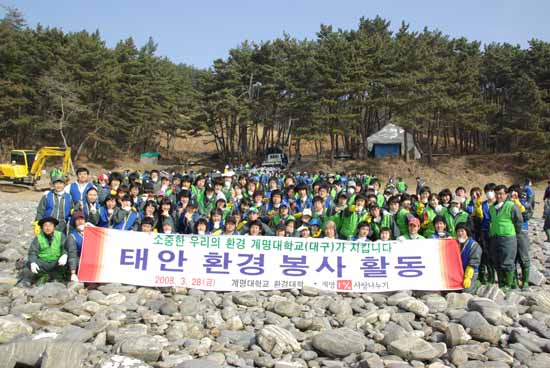 지난 3월 28일, (사)계명 1% 사랑나누기와 환경대학 교직원 및 학생 3백여 명이 충남 태안군 원북면 황촌리로 봉사활동을 떠났다. 교목실 변성준 씨는 “봉사활동에 대한 학생들의 관심이 지속적으로 증가했으면 좋겠다”고 당부했다.