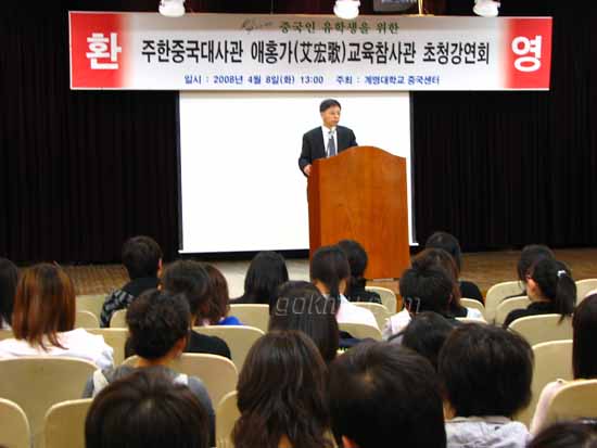 지난 8일 중국센터 주최의 초청강연회가 ‘한중관계 발전을 위한 유학생의 역할과 미래’라는 주제로 열렸다. 이날 강연은 중국인 유학생들의 자긍심을 높이기 위해 마련됐으며, 애홍가(艾宏歌) 중화인민공화국주대한민국 참사관이 강연을 맡았다.