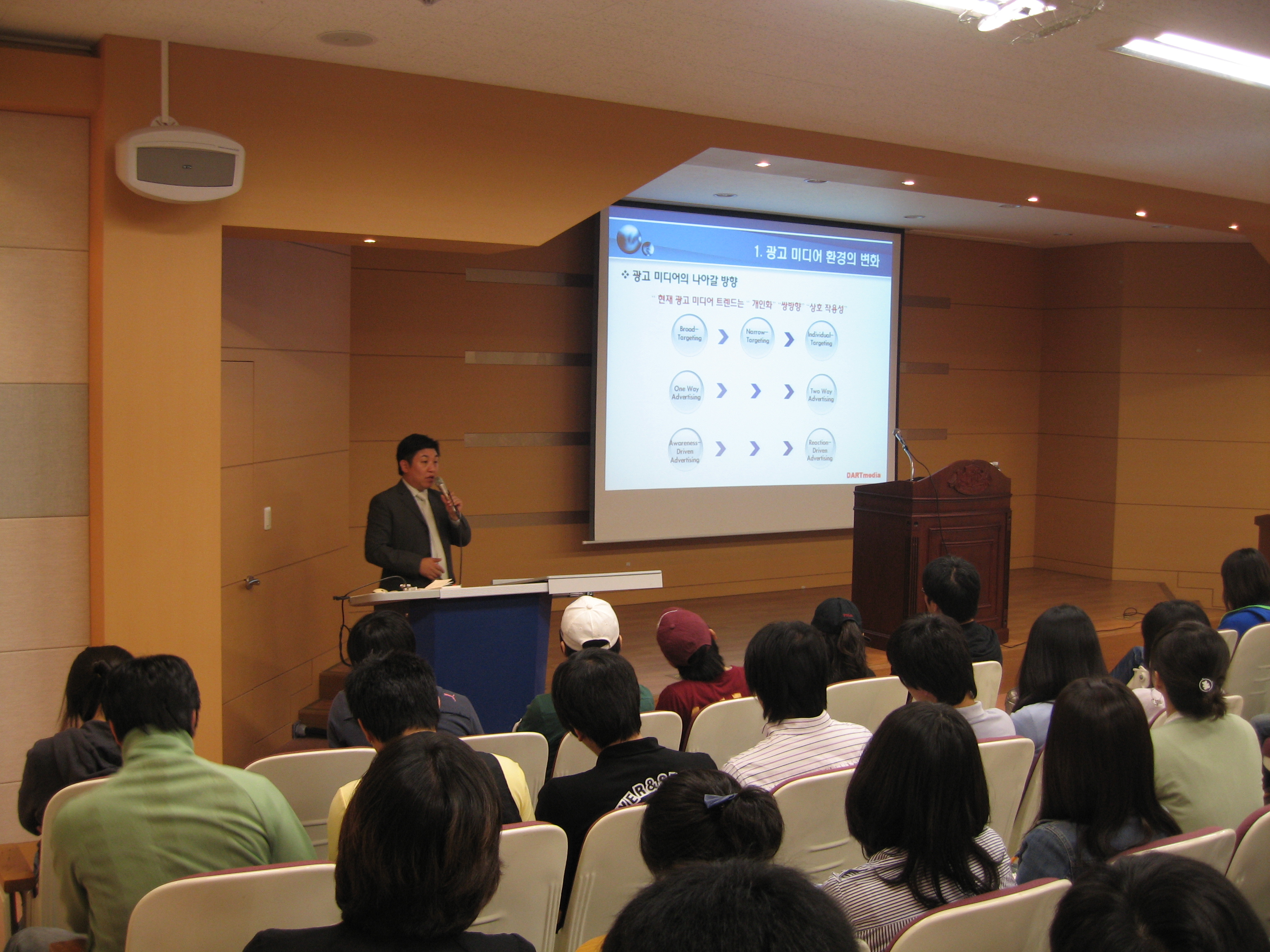 이번 특강은 새로운 매체인 IPTV를 미디어영상학부학생들에게 소개하고 취업정보를 주기 위해 개최되었으며, IPTV에 관한 전반적인 소개, IPTV분야 광고 현황, IPTV분야 미래, 취업에 대한 조언의 순서로 진행되었다. 이날 강연을 맡은 박천성 (주)다트미디어 대표는 “학생들이 IPTV의 경향을 파악해 IPTV분야 취업에 도움이 되었으면 좋겠다”고 밝혔다.