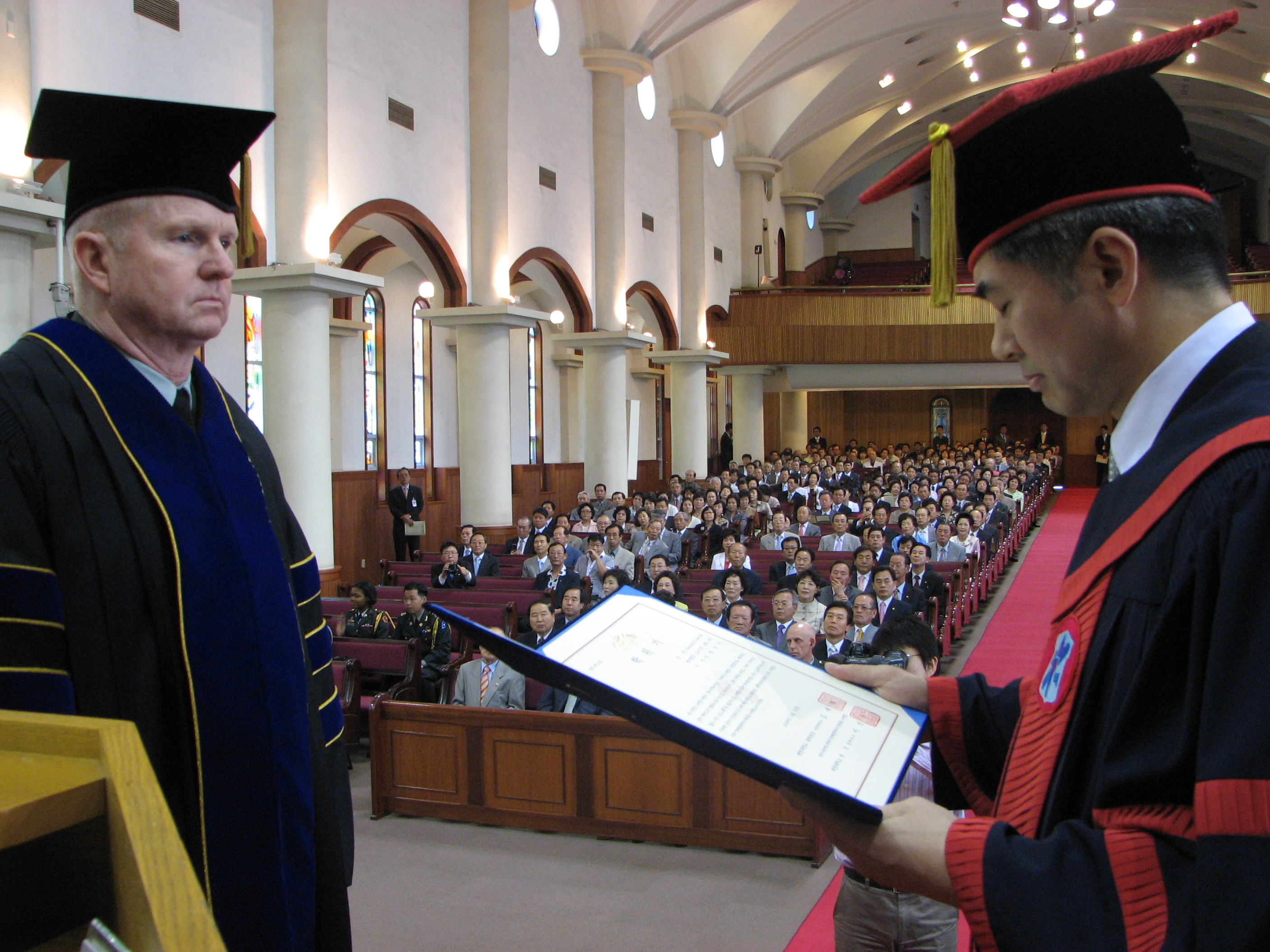 지난 20일, 아담스채플에서 열린 ‘명예철학박사 학위수여식’에서 버웰 벨(Burwell B.Bell Ⅲ)주한미군사령관이 명예철학박사 학위를 수여 받았다.