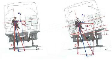 승객이 느끼는 횡방향 가속도, 즉 차체에 평행한 원심가속도의 성분은 일반차량인 경우 af= ac-gㆍφ 이며, 틸팅차량인 경우 af = acㆍ(φ + θ) 가 된다. 즉 동일한 속도로 주행한다고 가정할 경우 틸팅차량은 일반차량보다 gㆍφ 만큼 횡방향 가속도가 저하된다.