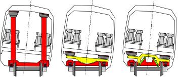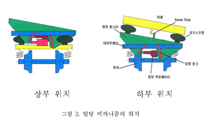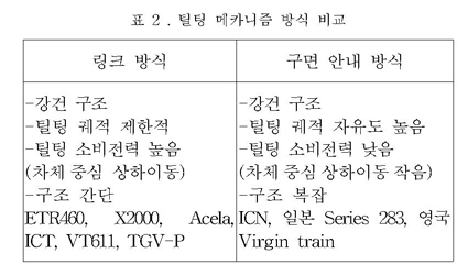 그림 2의 첫 번째 방식은 자연 틸팅 방식에 적용되는 것이며, 세 번째 방식은 강제 틸팅방식의 차량에 가장 많이 적용되는 방식이다.