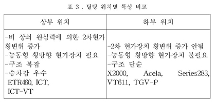 틸팅 메카니즘은 그림 3과 같이 2차 현가장치 상부에 위치하느냐 또는 하부에 위치하느냐에 따라 그 특성에 큰 차이를 보이게 된다. 표 2는 틸팅 메카니즘 위치별 특성을 비교 분석한 것이다. 하부위치의 경우 구조가 간단하여 유지보수에 유리하고, 기술 개발의 위험도가 상대적으로 낮은 방식으로 2차 현가장치 하부 위치를 말한다.