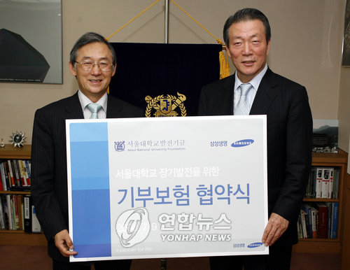 ▲ 삼성생명은 9일 서울대 대학본부 총장실에서 이 대학과 기부 보험 협약을 맺었다. 삼성생명과 기부 보험 협약을 맺은 대학은 서울대가 여섯 번째다.