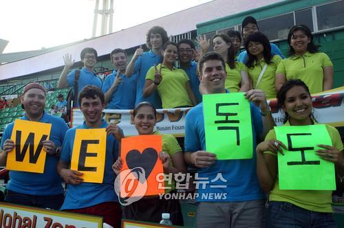 (부산=연합뉴스) 김승욱 기자 = 여름방학을 맞아 한국문화를 경험하러 온 외국 대학생들이 16일 부산 사직야구장에서 `We ♡ 독도'라고 적힌 플래카드를 펼쳐들었다.