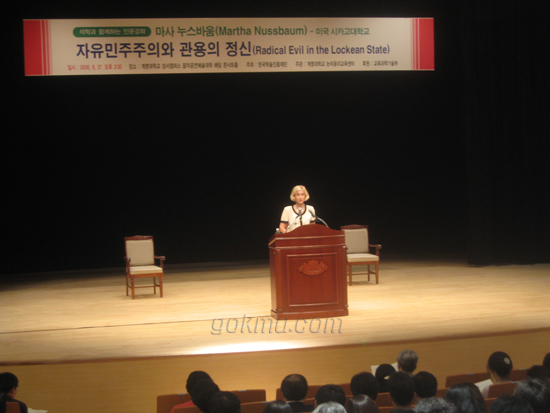 이날 초청 강사는 미국 시카고대학 마사 누스바움(법학·윤리학 교수) 교수가 맡았으며 ‘자유민주주의와 관용의 정신’이라는 주제로 강연했다.