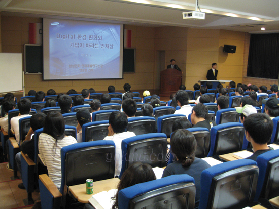 강연을 맡은 삼성전자 인사총무담당 안승준 전무는 디지털 경영환경분석, 한국경제와 기업의 역할, 삼성전자 인재상 등에 대해 이야기 했다.