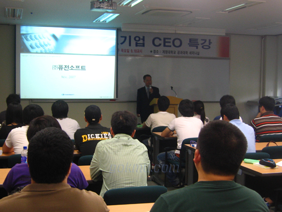 강연을 맡은 (주)퓨전 소프트 박경욱 사장은 CEO가 되기까지 걸어왔던 길, 직장생활에 필요한 기본사항, 컴퓨터 프로그램 등에 대해 설명했다.