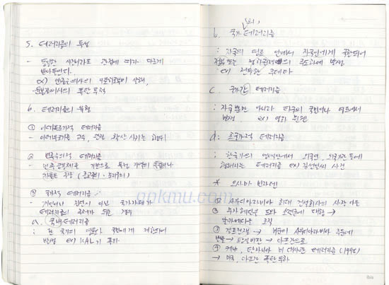 ① 수업시간 동안 교수님께서 말씀하시는 내용을 모조리, 가능한 한 전부 받아 적는다. 이 때 중요하다고 생각하는 부분엔 형광펜이나 색연필 또는 나만의 암호로 중요성을 강조한다.