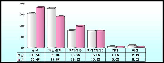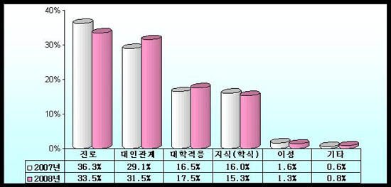 대학생활에서 가장 도움을 받고 싶은 부분은 진로(33,3%), 대인관계(31,5%) 순으로 나타나 장래의 진로와 다양한 대인관계 형성의 기회를 부여하여야 할 것으로 나타났다. 전년도에 비하여 진로는 조금 감소, 대인관계는 조금 증가하였다.