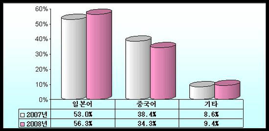 남학생은 대인관계의 비율이, 여학생은 진로와 대학적응에 대한 비율이 상대적으로 높게 나타나, 남녀별로 도움을 받고 싶은 부분에 차이가 있음을 알 수 있다.● 제2외국어선호도?