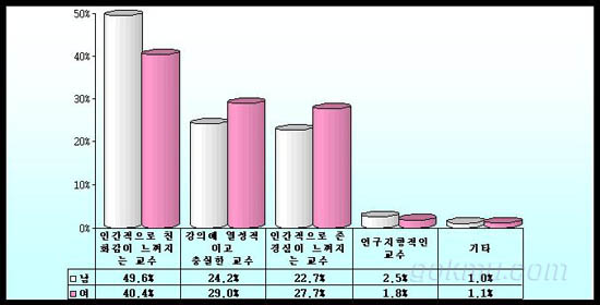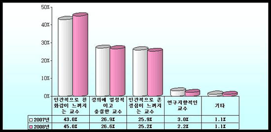 바람직하다고 생각하는 교수상으로는 ‘인간적으로 친화감이 느껴지는 교수’가 45%이고, ‘강의에 열성적이고 충실한 교수’가 26.6%, ‘인간적으로 존경심이 느껴지는 교수’가 25.3%로 나타나 학생들과 함께 어울리면서 학생지도에 관심을 많이 보이는 교수를 학생들이 선호하는 것으로 나타났다.