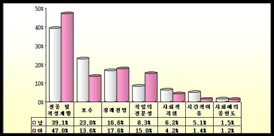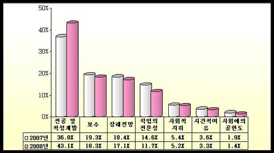 직업 선택에 있어서 가장 중요한 기준으로는 전공 및 적성계발이 43.1%, 보수가 18.3%, 장래전망이 17.1% 순으로 나타났다. 전공과목에 대한 전문지식을 습득하게 하여 본인의 전공과 적성을 계속 살릴 수 있는 직업을 선택할 수 있도록 교육 및 지도가 이루어져야 할 것이다.