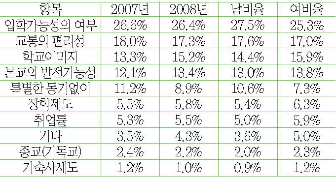 계명대학교를 선택한 이유로 남학생은 입학가능성의 여부와 교통의 편리성에, 여학생은 학교이미지 및 장학제도, 취업률에 상대적으로 높은 비율을 나타냈다.