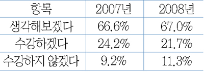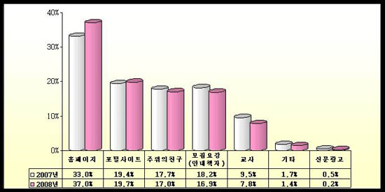 학과(전공) 선택을 위한 정보출처는 홈페이지와 포털사이트가 56.7%로 인터넷을 가장 중요한 정보출처로 여기고 있다. 체계적이고 다양한 정보를 제공해줄 수 있는 홈페이지을 구축하는 것이 입시홍보에 상당한 효과가 있음을 보여주고 있다.● 영어로 진행하는 강의 수강의사?
