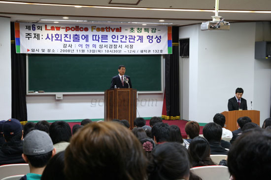 지난 13일 경찰행정학과 초청특강이 쉐턱관 132호에서 열렸다. 이번 초청특강에는 이현희 성서경찰서장이 초청돼 ‘사회진출에 따른 인간관계 형성’이란 주제로 강연을 진행했다.