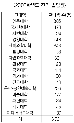 지난 2월 17일 ‘2008학년도 전기 대학 학위 수여식’이 각 단대 및 학과별로 진행됐다. 이번 대학 학위 수여식에는 비사최우수상을 수상한 김경림(문예창작학·08졸업)씨를 비롯해 총 3천7백31명의 졸업생들이 학사학위를 받았다.