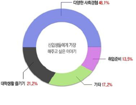 그러나 재직자나 구직자들은 새내기들에게 스펙을 만들라는 조언보다 동아리나 봉사활동, 아르바이트 등의 경험을 해보라고 권한다. 실제 취업정보 사이트 에듀스(www.educe.co.kr)에서 재직자와 구직자 852명을 대상으로 실시한 ‘대학 새내기들에게 가장 먼저 해주고 싶은 이야기는 무엇인가?’란 설문조사의 1위를 차지한 대답이 ‘동아리, 사회봉사, 아르바이트 등 다양한 사회경험을 먼저 시작해라(48.1%)’였다. 2위를 차지한 대답 역시 ‘대학생활을 먼저 즐겨라(21.2%)’였다. 학생들이 가장 중요하게 생각하는 ‘학점, 토익, 자격증 등 취업준비를 일찍 시작하라’는 답은 13.5%에 그쳤다.