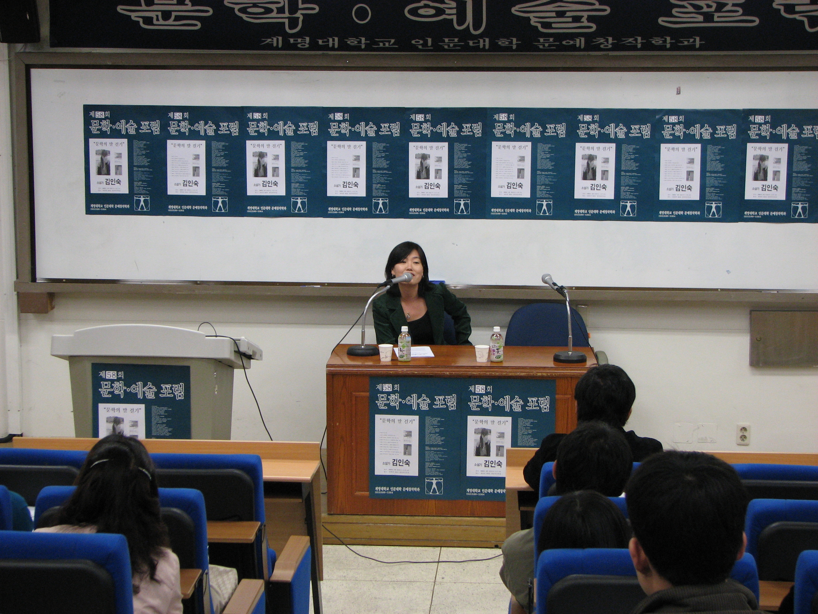 지난 25일 영암관에서 문예창작학과 주최, 2009년 첫 번째 문학·예술포럼이 ‘문학에 말 걸기’라는 주제로 열렸다. ‘제국의 뒷길을 걷다’의 저자 김인숙 소설가가 초청돼 자신에게 있어 문학이란 무엇인지에 대해 강연 했으며, 그 후 사인회 및 질의응답의 순서로 행사가 진행됐다.