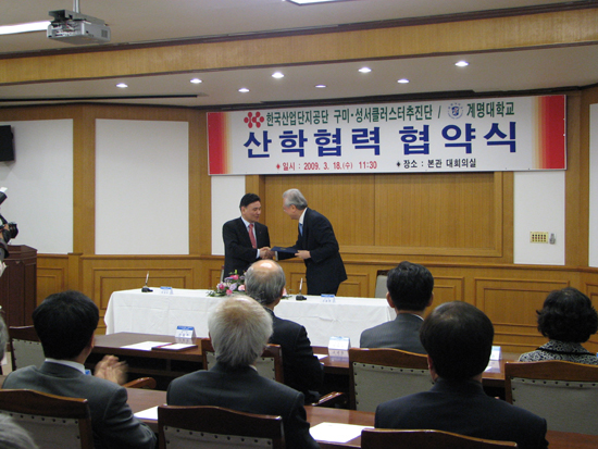지난 18일, 한국산업단지 구미·성서 클러스터 추진단과 우리학교 간에 산학협력 협약식이 열렸다. 본관 대회의실에서 진행됐으며 신일희 총장, 박광석 한국산업단지 구미·성서 클러스터 추진단장, 한문식(기계·자동차공학부·교수) 산학협력단장 등 40여명이 참석한 가운데 양해각서 체결이 이루어졌다.