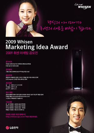 LG전자가 주최하는 ‘2009 Whisen Marketing Idea Award’가 오는 5월 15일까지 열린다. 이번 공모 주제는 ‘휘센의 브랜드 아이덴티티 구축과 이미지 강화를 위한 브랜드 커뮤니케이션 전략’이며, 기획서는 애니메이션 효과를 적용하지 않은 PPT파일 30장 이내이고 20MB이내의 분량이어야 한다.