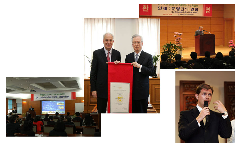 지난 3월 16일, 노르베르트 바스 주한 독일대사가 우리학교를 방문해 ‘유럽·아시아 관계에서 한국과 독일의 역할’이라는 주제로 특강을 했으며, 특임교수로 임명됐다. 지난 2일에는 후안 레냐 주한 스페인 대사가 ‘문명간의 연합’이라는 주제로 특강을 진행했고, 지난 7일에는 주한 이탈리아 마테오 로미텔리 부대사가 내방해 와인특강을 펼쳤다.