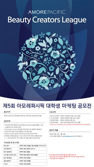 아모레퍼시픽이 주최하는 '제 5회 아모레퍼시픽 대학생 마케팅 공모전'이 오는 5월 18일까지 열린다. 이번 공모전은 아모레퍼시픽의 특화된 Green경영을 실현할 수 있는 신상품 제안 및 프로모션 전략 등 총 5가지 주제 중 하나를 선택하여 응시하면 된다. 최우수상을 수상한 1개 팀에게는 장학금 1천만 원과 함께 상패와 부상, 인턴쉽 기회가 제공 된다.분류 : 마케팅