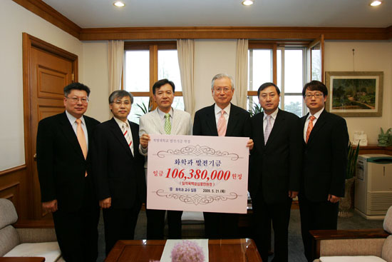 지난 21일, 화학과 소속 교수들이 본관 접견실에서 후학 양성을 위해 발전기금 약정식을 가졌다. 이진호(화학·부교수) 학과장 외 교수 5명은 “경제상황이 어려워 학업이 어려운 학생들에게 도움을 주고자 뜻을 모았다”고 말하며, 1억6백38만원의 발전기금 약정서를 전달했다. 재학생들의 장학금 및 학과발전기금으로 사용될 이 기금은 교수들이 퇴직 시까지 매달 일정액을 납부하여 모을 예정이다.