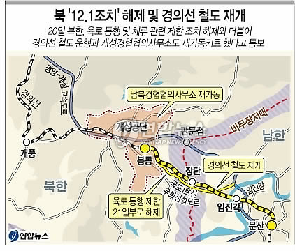 (서울=연합뉴스) 김귀근 조준형 유현민 기자 = 북한이 작년 12월1일부터 남북관계 1단계 차단조치로 시행해온 이른바 `12.1조치'를 21일부로 전면 해제키로 했다.