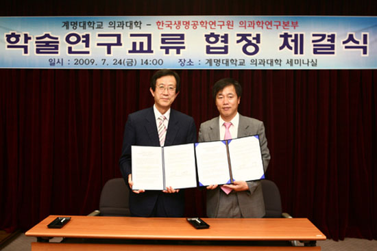우리학교 의과대학과 한국생명공학연구원 의과학연구본부가 지난 7월 24일 의과대학에서 학술·연구교류 협정식을 가졌다. 이로써 향후 교육연구에 관한 경험과 정보교류, 시설공동 활용, 데이터베이스 등을 통하여 인재의 효율적인 육성이 가능하게 된다. 또한, 인체에 유해한 감염체 백신, 진단치료기법 등의 연구과제를 공동으로 개발할 예정이다.