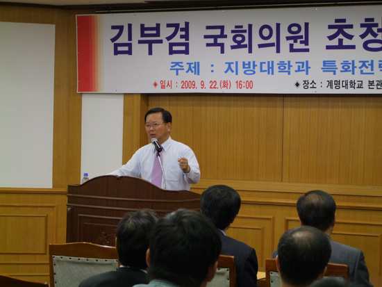 먼저 오후 2시부터 국제학대학이 주최하는 명사초청특강에서 김부겸 국회의원은 ‘처세와 치세’라는 주제로 강연을 했으며, 이후 본관 대회의실에서 열린 특강에서는 ‘지방대학과 특화전략’이라는 주제로 이야기했다.