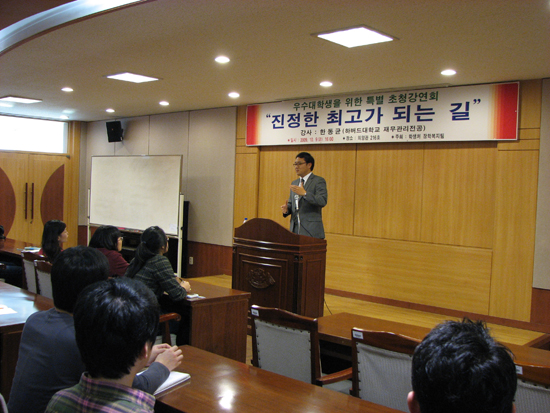 연사로 초청된 한동균 씨는, ‘진정한 최고가 되는 길’이라는 주제로, 대구에서 초·중·고를 나온 뒤 고려대를 거쳐 하버드대로 진출하기까지의 계기와 과정을 이야기했다. 그는 학생들에게 ‘진정한 최고(Elite)’가 되고 싶다면 판단능력과 리더십 그리고 도전의식을 갖춰야 한다고 조언했다.
