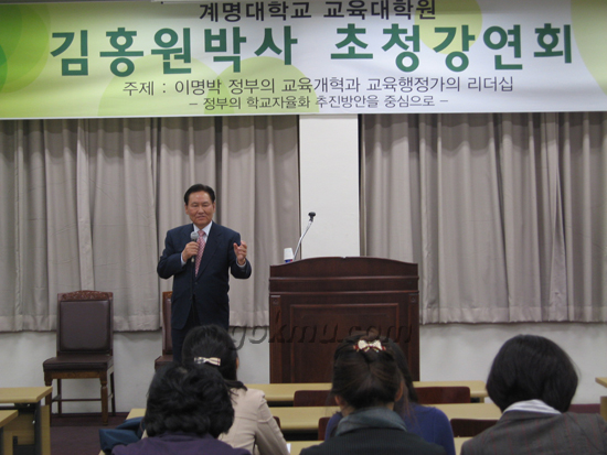 지난 22일, 대학원 437호에서 ‘이명박 정부의 교육개혁과 교육행정가의 리더십’이라는 주제로 김홍원(명지대·교육대학원·초빙교수) 박사가 초청돼 특강을 진행했다.