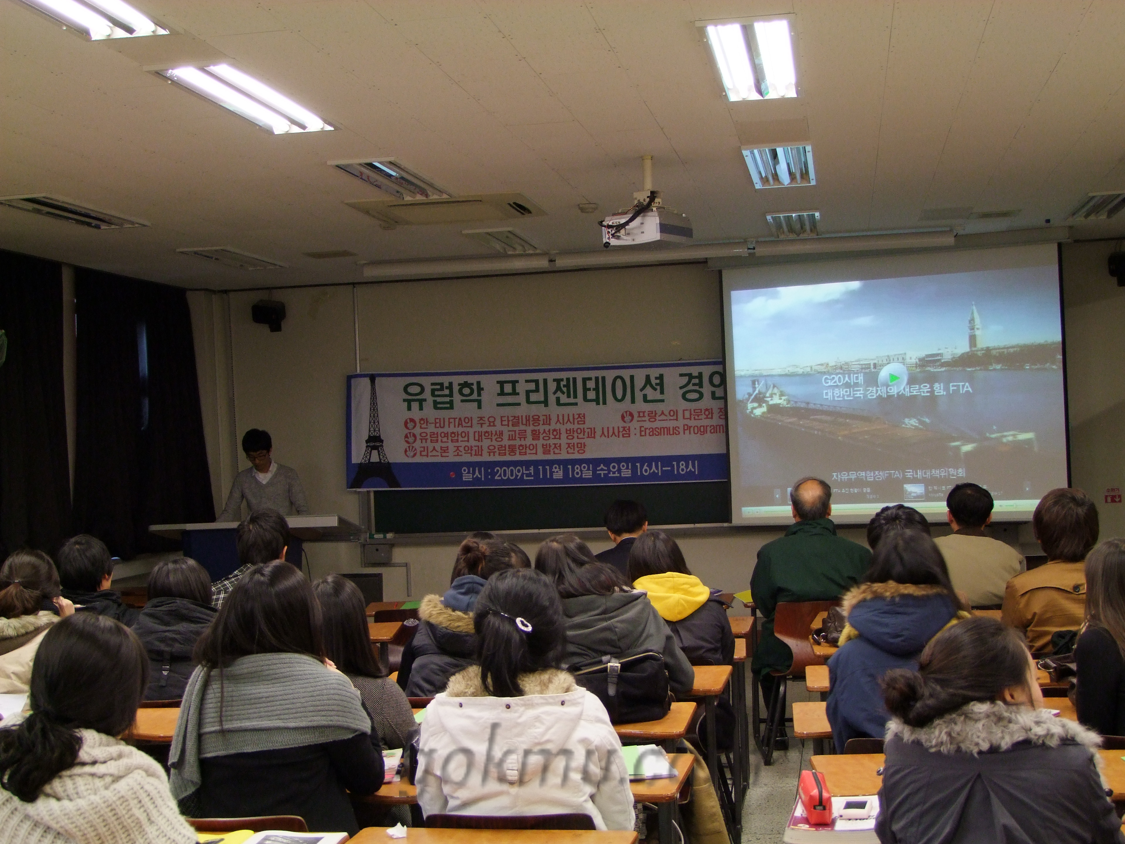이번 ‘유럽학 학술제’는 유럽학과 재학생 및 국제학대학 학생이 참여하는 유럽학 프리젠테이션 경연대회와 Havertz(국제관계학·조교수) 교수의 초청특강, 유럽학의 밤 등의 순서로 진행됐다. 이날 열린 프리젠테이션 경연대회에서 ‘한·EU FTA의 주요 타결내용과 시사점’을 발표한 이진우(유럽학·2) 씨는 “한·EU FTA는 국내 정치, 경제, 문화 등 전 분야의 다변화에 큰 기여를 할 것”이라며 “유럽의 공동체적 사회적 가치가 우리나라에 적용될 수 있는 계기가 되길 바란다”고 말했다.
