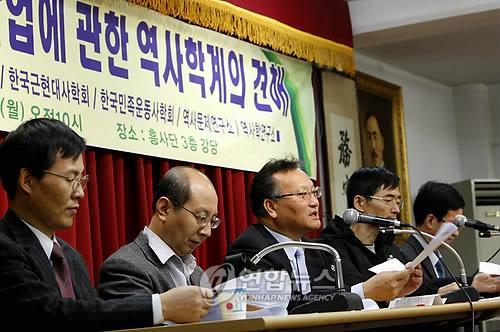 한국사연구회와 한국역사연구회 등 6개 학술단체는 30일 서울 종로구 흥사단에서 기자회견을 열고 "두 단체의 작업은 식민 지배를 경험한 민족이 일제 잔재와 협력에 대해 역사적인 정리를 시도했다는 점에서 의미가 있다"고 평가했다.