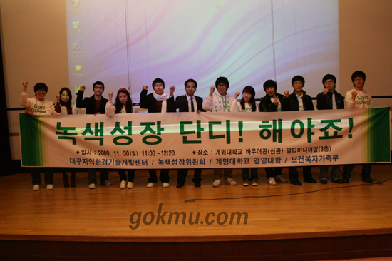 이날 녹색성장 특강에서는 정응호(에너지환경계획학과·조교수) 교수가 “녹색성장을 통한 추가성장으로 GDP증대가능성과 세계적인 녹색성장 모범국가 구현이 현 정부의 목표이다”라고 말했다.