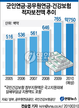 (서울=연합뉴스) 윤근영 기자= 지난해 금융위기 상황에도 불구하고 군인연금, 공무원연금, 국민건강보험 등 3개 공적 연금.보험에 대한 정부 지원액이 8조원에 육박했다.