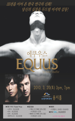 연극 ‘에쿠우스’가 3월 20일 3시와 7시 각각 두 차례 수성아트피아에서 공연된다. 에쿠우스는 1973년 영국 초연 살인을 소재로 한 배우들의 전라 연기로 공연마다 많은 열풍을 불러 일으켰다. 이작품은 1973년 극단 ‘실험극장’의 개관작으로 한국 초연 이후 국내 공연의 최다 공연 기록을 수록했다. 올해 한국 상연 35년을 맞이하여 더욱 높은 작품성으로 관객에게 다가간다.
