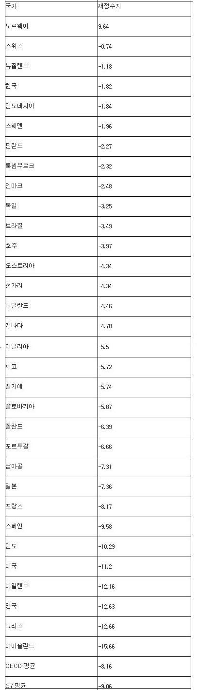 경제협력개발기구(OECD)는 최근 주요 20개국(G20), OECD 회원국 그리고 대륙별 대표 신흥국 가운데 32개국을 대상으로 지난해 정부 재정수지를 추계한 결과 노르웨이가 국내총생산(GDP) 대비 9.64% 흑자로 가장 좋았고 스위스(-0.74%), 뉴질랜드(-1.18%), 한국(-1.82%), 인도네시아(-1.84%) 순이었다.