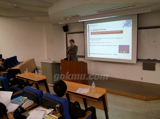 이날 행사는 DAAD한국사무소장 Michael Paulus 연사로 진행됐으며, ‘유럽의 고등교육 개혁 및 에라스무스 문두스 제도’에 대해 발표한 후 DAAD연수 담당관인 이호정 씨가 ‘독일 유학 및 장학금’에 관한 이야기를 했다.