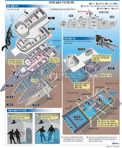 군은 함미 부분에서는 가용 잠수사 27개조 54명을 교대로 투입해 좌현 출입구에서 승조원 식당까지 인도줄을 연결하는 동시에 각 선실을 탐색할 예정이다.