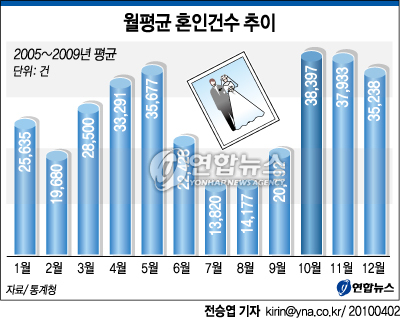 월별 평균 혼인 건수는 10월이 3만8천397건으로 가장 많았고, 11월이 3만7천933건으로 뒤를 이었다. 사람들이 흔히 생각하는 `결혼의 달'인 5월은 3만5천677건으로 3위였다.
