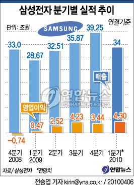 (서울=연합뉴스) 김종수 홍지인 기자 = 지난해 세계 경기침체 속에서도 `매출 100조(136조원)-영업이익 10조(10조9천200억원)원대' 동시 돌파라는 대기록을 세운 삼성전자가 그 여세를 몰아 올 1분기에도 이전 최고치(작년 3분기 4조2천300억원)를 넘는 사상 최대의 영업이익을 올린 것으로 나타났다.