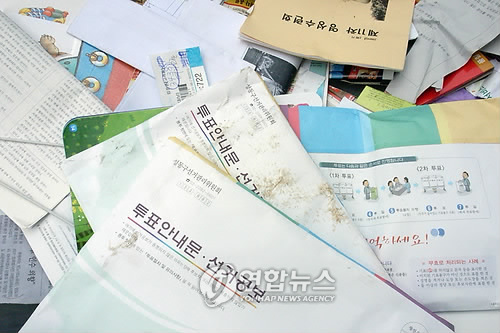 재활용품 수거함 안에 선거공보 봉투가 개봉되지 않은 상태로 뒹굴었다. 아파트 관리인은 "최근에 이사한 사람에게 온 자료라 그냥 버린 모양이다"고 말했다.