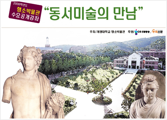행소박물관에서는 우리 전통문화를 사랑하는 지역민들을 위해 심도있는 문화학습 기회를 제공하고자 『2006학년도 행소박물관 수요공개강좌』를 9월 20일(수)부터 개최한다고 밝혔다. 이번 강좌는 ‘동서미술의 만남’을 대주제로 전문가와 대학교수로 구성된 강사진이 강의를 진행하게 된다. 일반 시민이면 누구나 무료로 수강이 가능하며 9월 20일, 10월 18일, 11월 22일 (3회) 오후 3시부터 2시간동안 계명대학교 행소박물관 시청각실에서 실시된다.