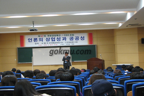 이날 강연은 한겨레통일문화재단 서형수 이사가 맡았으며, ‘언론의 상업성과 공공성’이라는 주제로 진행됐다.